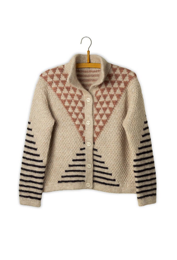 Het jasje wordt top-down gebreid. Eerst worden steken achter in de nek opgezet en heen en weer gebreid in strepen met meerderingen voor de schouders. Wanneer de schouders hun uiteindelijke breedte hebben bereikt, wordt er in dubbel mossteek op het rugpand gebreid tot de armsgatdiepte is bereikt. Tegelijkertijd wordt er in het midden van het rugpand een klein driehoekpatroon in intarsia gevormd.