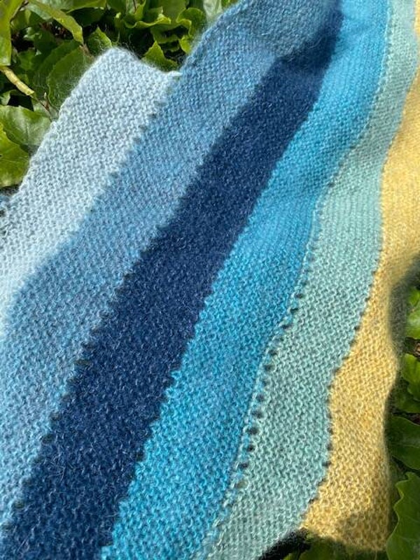 Deze sjaal is gebreid van de Spinni en Silk mohair, beide van Isager. We hebben een pakket gemaakt op maat. Natuurlijk zijn andere kleuren ook mogelijk, maar dan zal de prijs iets hoger zijn.